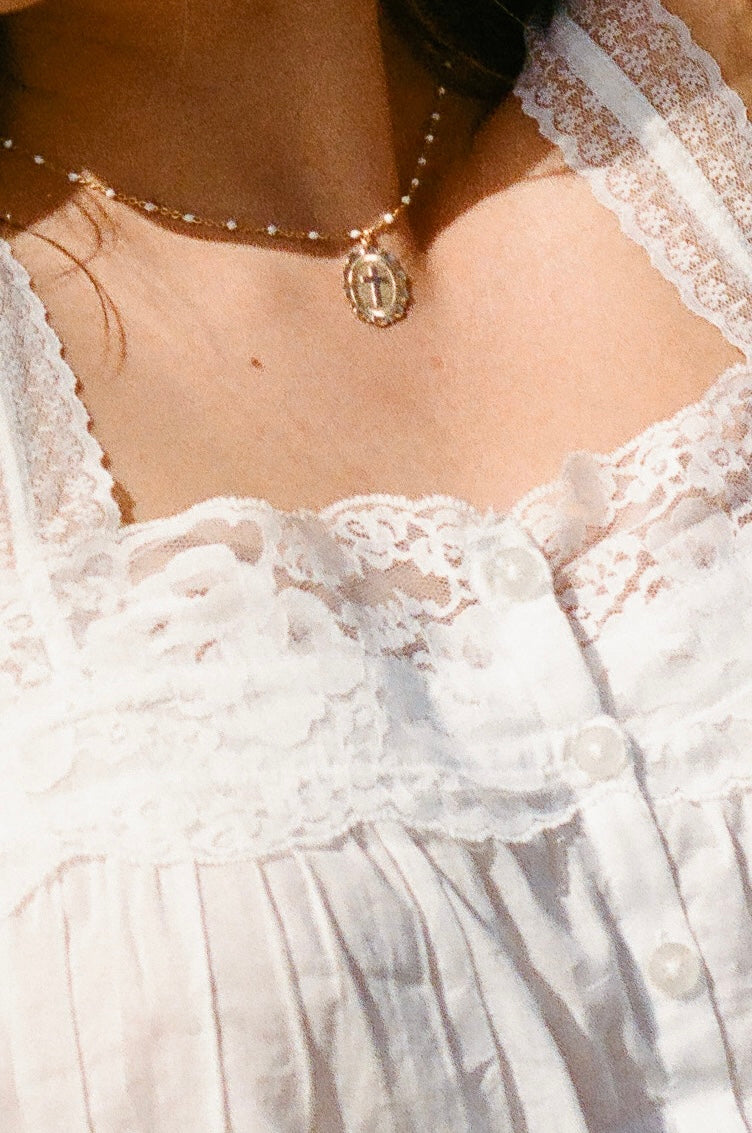 This delicate handmade necklace pairs a graceful cross charm with a 14k gold-filled, and evoking quiet vintage charm. Customize your piece by adding one or more vintage pearls for a softer, more defined look. A gentle reminder of faith and timeless beauty.