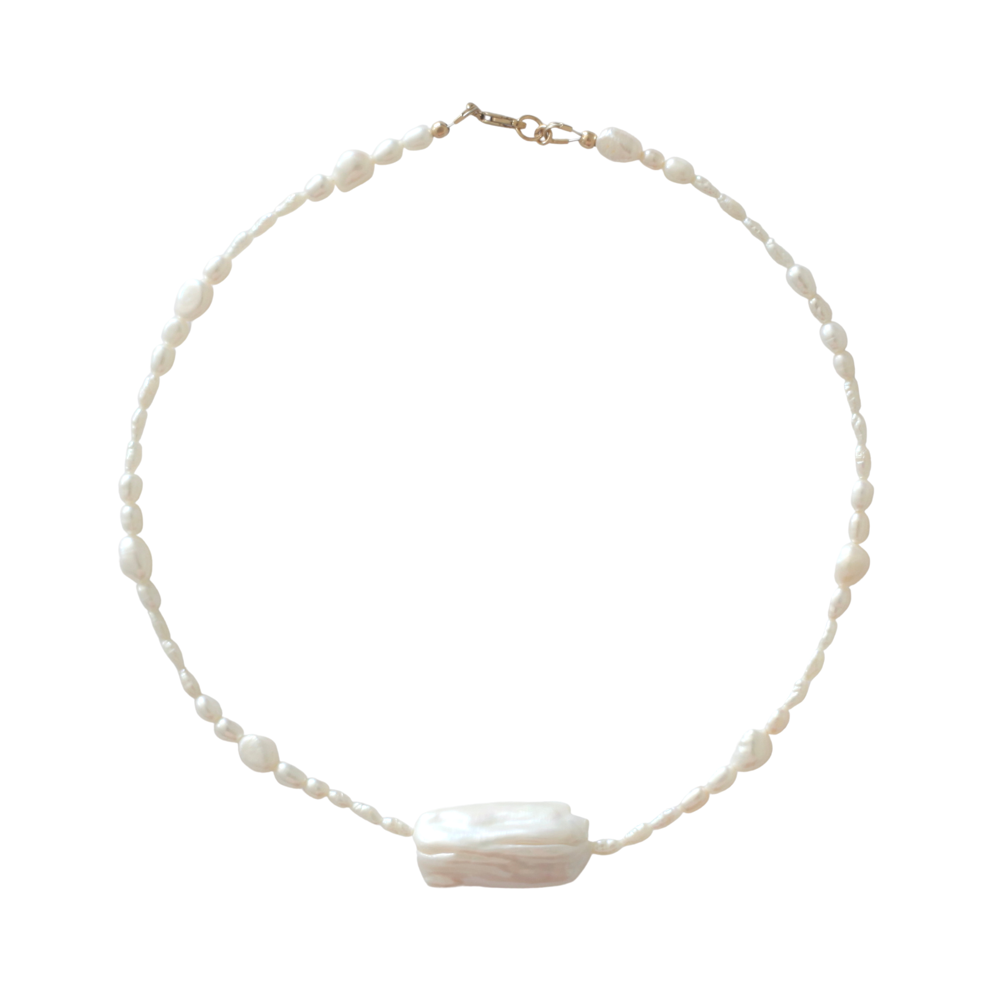 The iridescent baroque pearl pedant is the star of this necklace. One of kind meaning each one may vary slightly in size and shape due to the nature of pearls.