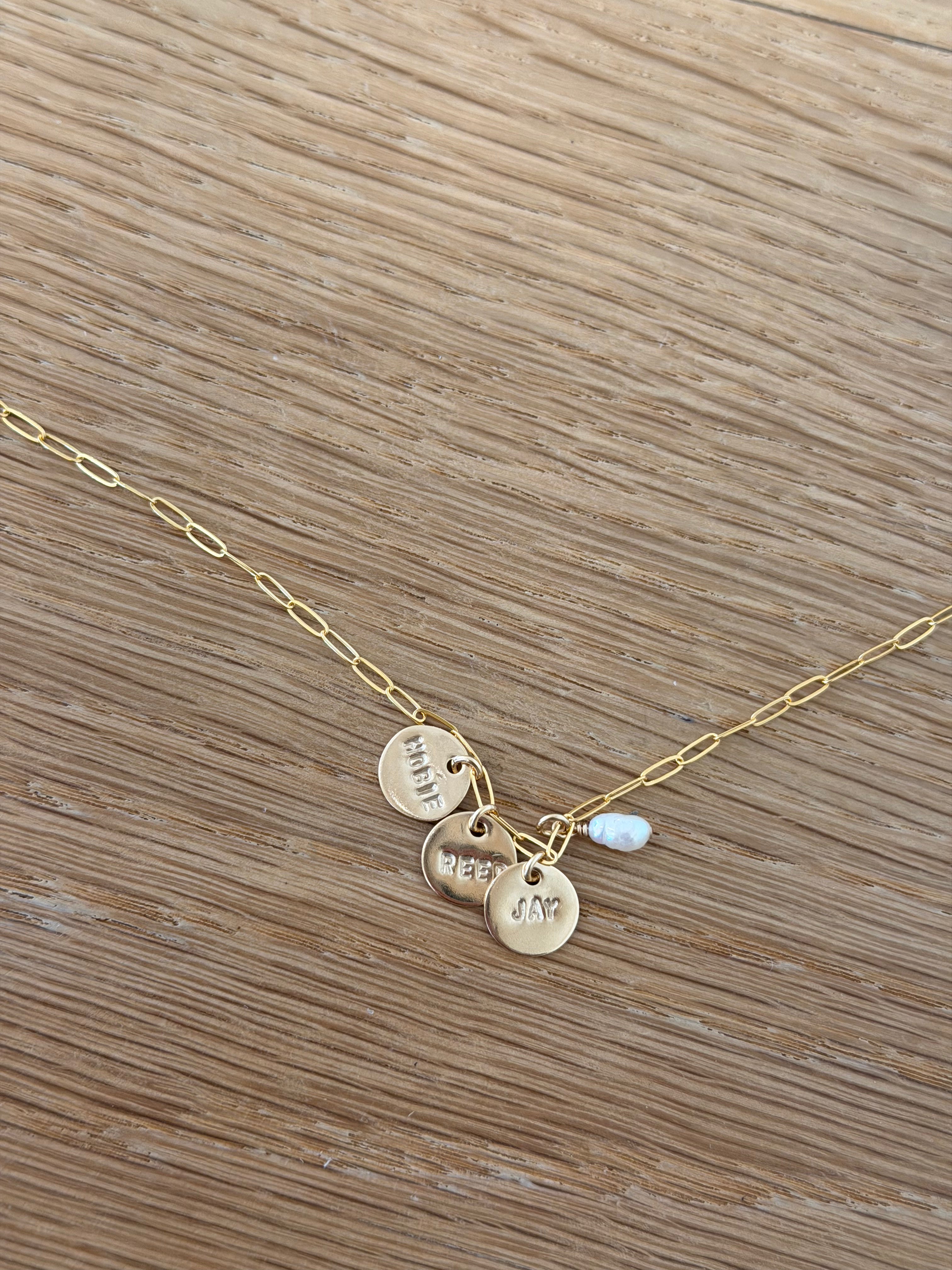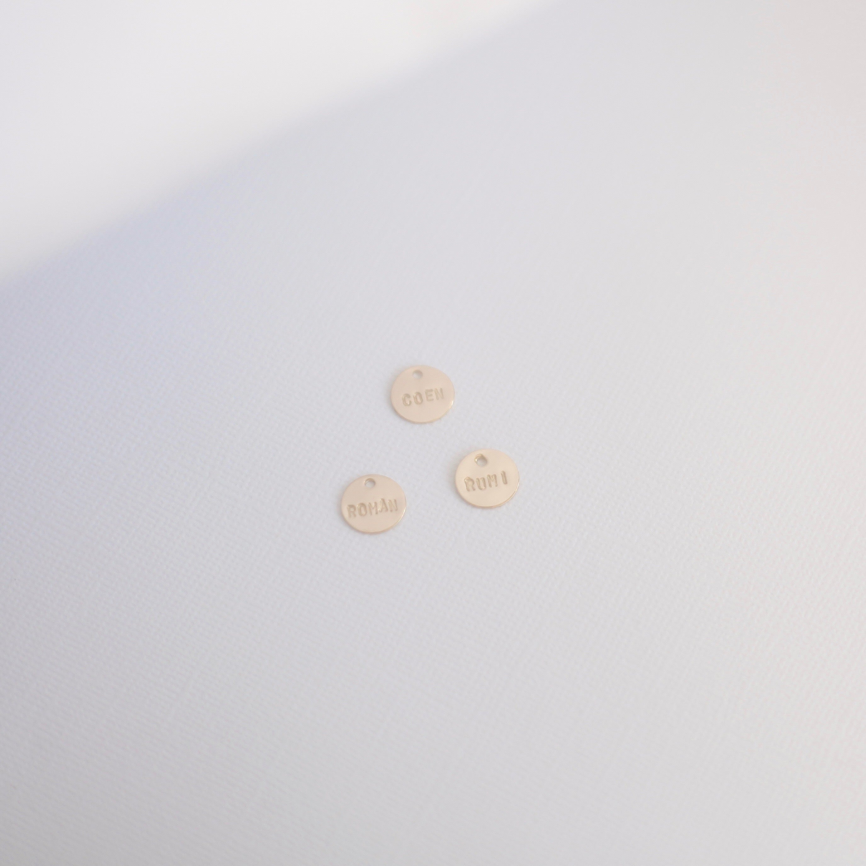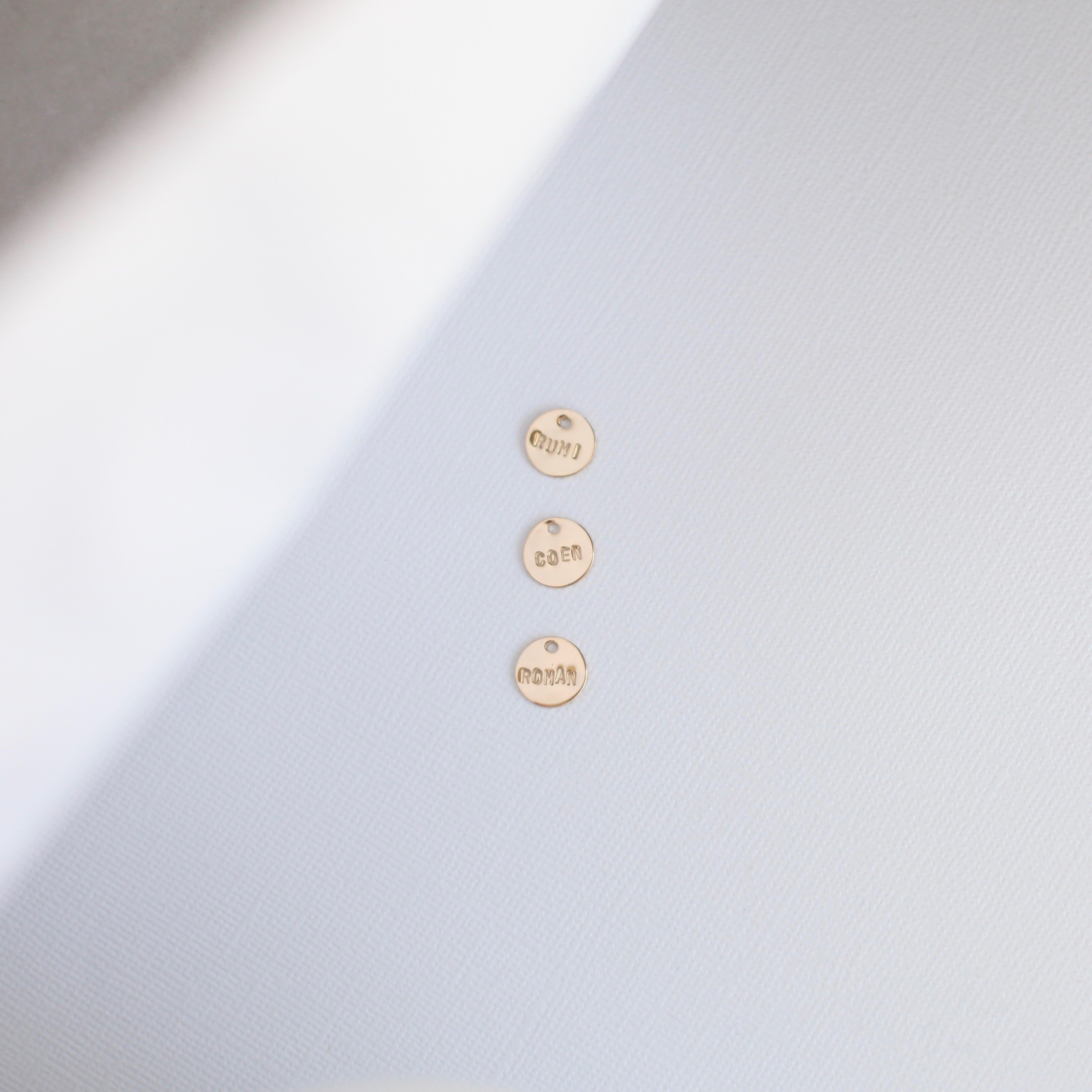 Carry a special reminder with you wherever you go with the Custom Disk Necklace. Featuring a hand-stamped disk with up to five characters of your choice, you can proudly wear your special letter/word or the name of someone you love near your heart. Choose from 4 different chain options - all comfortably lightweight and perfect for daily wear, this necklace is a special way to carry your favorite words with you.