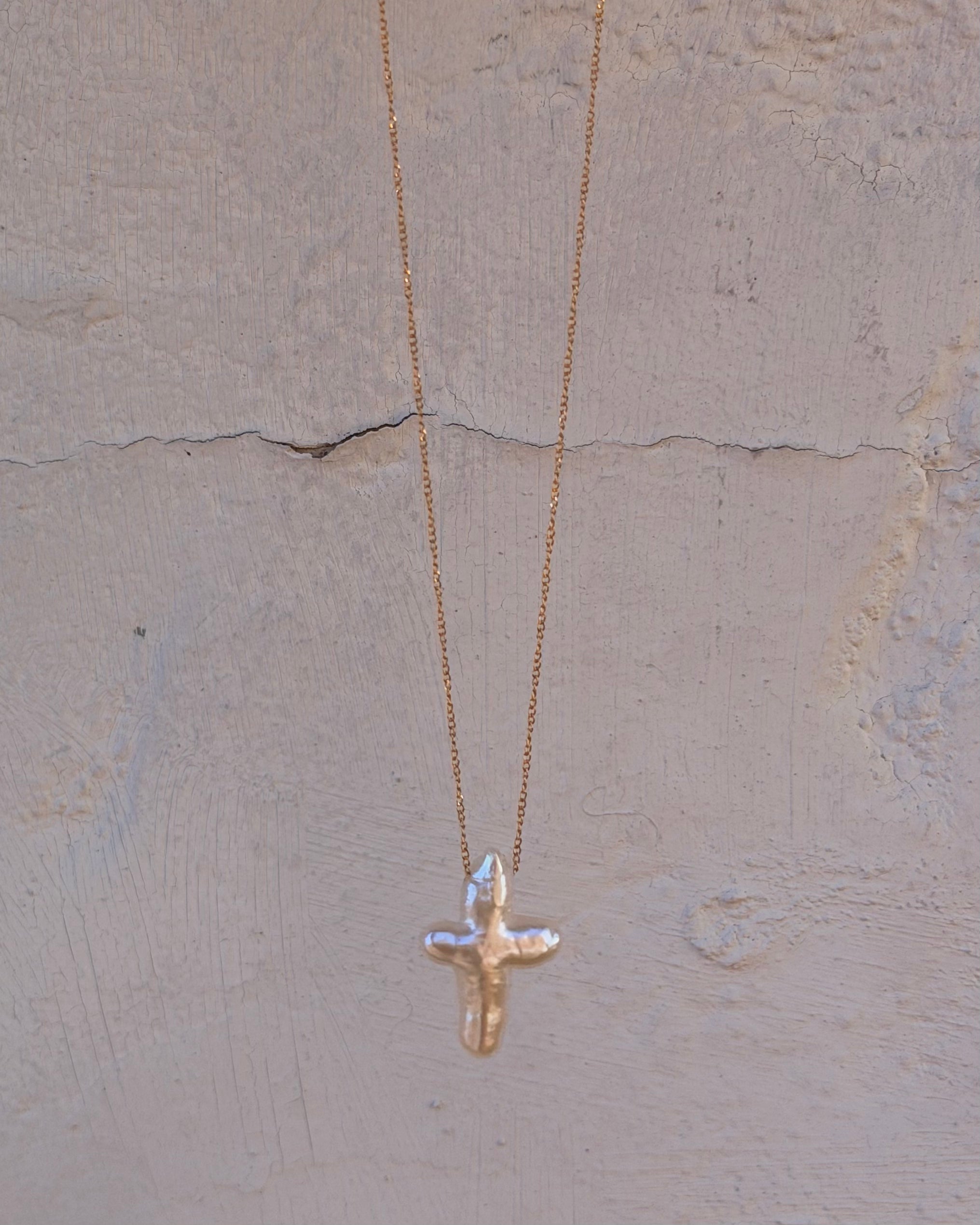 14k gold-filled. Genuine pearl, naturally-shaped cross.