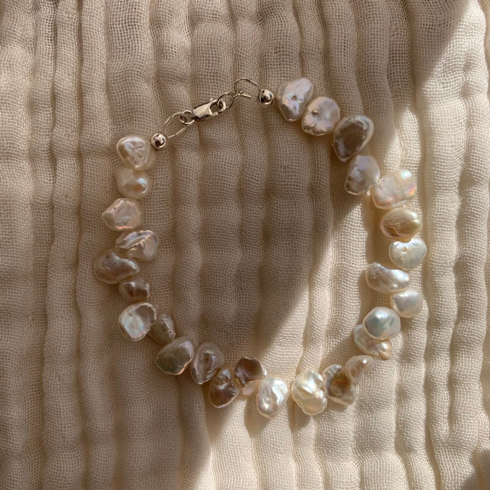 Unique and one of a kind. Freshwater crispy cornflake shaped pearls make a statement and pairs well with all colours. Very limited quantities available.